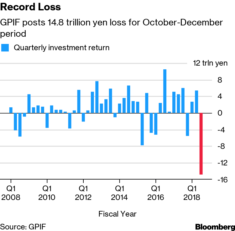 The world’s biggest pension fund posted a record loss after a global equity rout last quarter pummeled an asset class that made up about half of its investments. Japan’s Government Pension Investment Fund lost 9.1 percent, or 14.8 trillion yen ($136 billion), in the three months ended Dec. 31, it said in Tokyo on Friday. The decline in value and the rate of loss were the steepest based on comparable data back to April 2008. Domestic stocks were the fund’s worst performing investment, followed by foreign equities. Assets fell to 150.7 trillion yen at the end of December from a record 165.6 trillion yen in September.