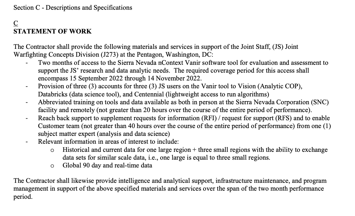 Specifically, the document points to a product called “the Sierra Nevada nContext Vanir software tool.” The contract covers a number of different areas, including support and training, both remotely and at the contractor’s facility; two months of access to the tool for “evaluation and assessment;” and “intelligence and analytical support.” The Navy paid $174,941.37 for access to the data, according to the contract.