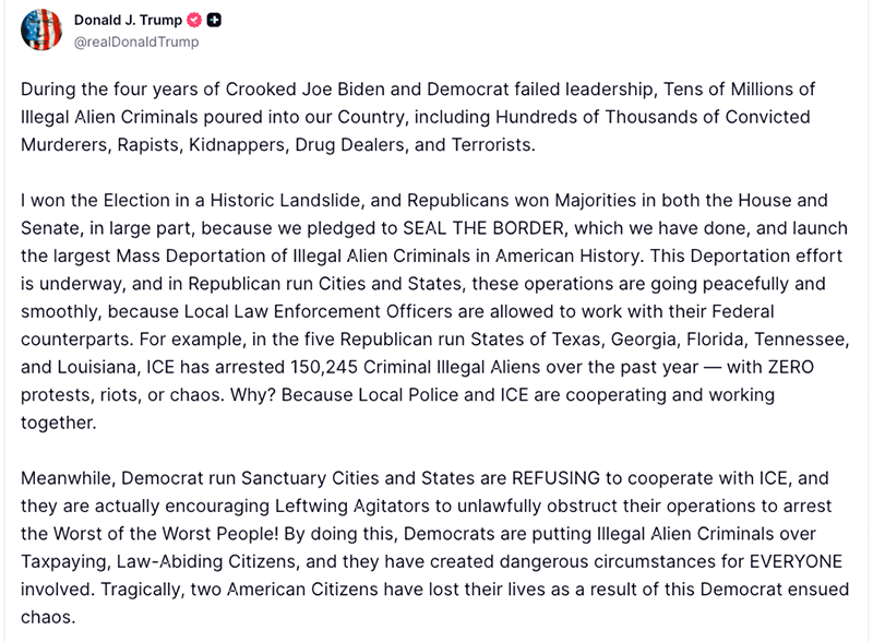 I won the Election in a Historic Landslide, and Republicans won Majorities in both the House and Senate, in large part, because we pledged to SEAL THE BORDER, which we have done, and launch the largest Mass Deportation of Illegal Alien Criminals in American History. This Deportation effort is underway, and in Republican run Cities and States, these operations are going peacefully and smoothly, because Local Law Enforcement Officers are allowed to work with their Federal counterparts. For example, in the five Republican run States of Texas, Georgia, Florida, Tennessee, and Louisiana, ICE has arrested 150,245 Criminal Illegal Aliens over the past year — with ZERO protests, riots, or chaos. Why? Because Local Police and ICE are cooperating and working together.