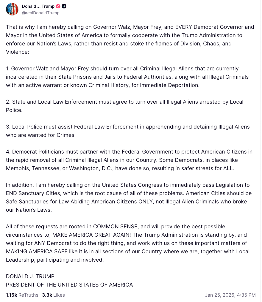 That is why I am hereby calling on Governor Walz, Mayor Frey, and EVERY Democrat Governor and Mayor in the United States of America to formally cooperate with the Trump Administration to enforce our Nation’s Laws, rather than resist and stoke the flames of Division, Chaos, and Violence: