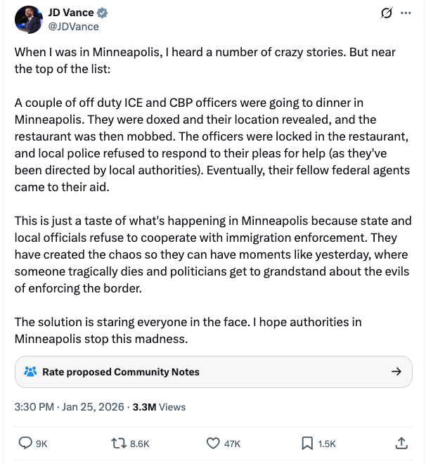 “This is just a taste of what’s happening in Minneapolis because state and local officials refuse to cooperate with immigration enforcement,” the VP wrote on X. “They have created the chaos so they can have moments like yesterday, where someone tragically dies and politicians get to grandstand about the evils of enforcing the border.”