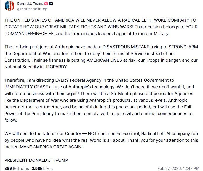 Update (1603ET): An hour before a 5PM ET deadline, President Donald Trump directed ‘EVERY Federal Agency in the United States Government to IMMEDIATELY CEASE all use of Anthropic’s technology,” posting on Truth Social that “We don’t need it, we don’t want it, and we will not do business with them again.”